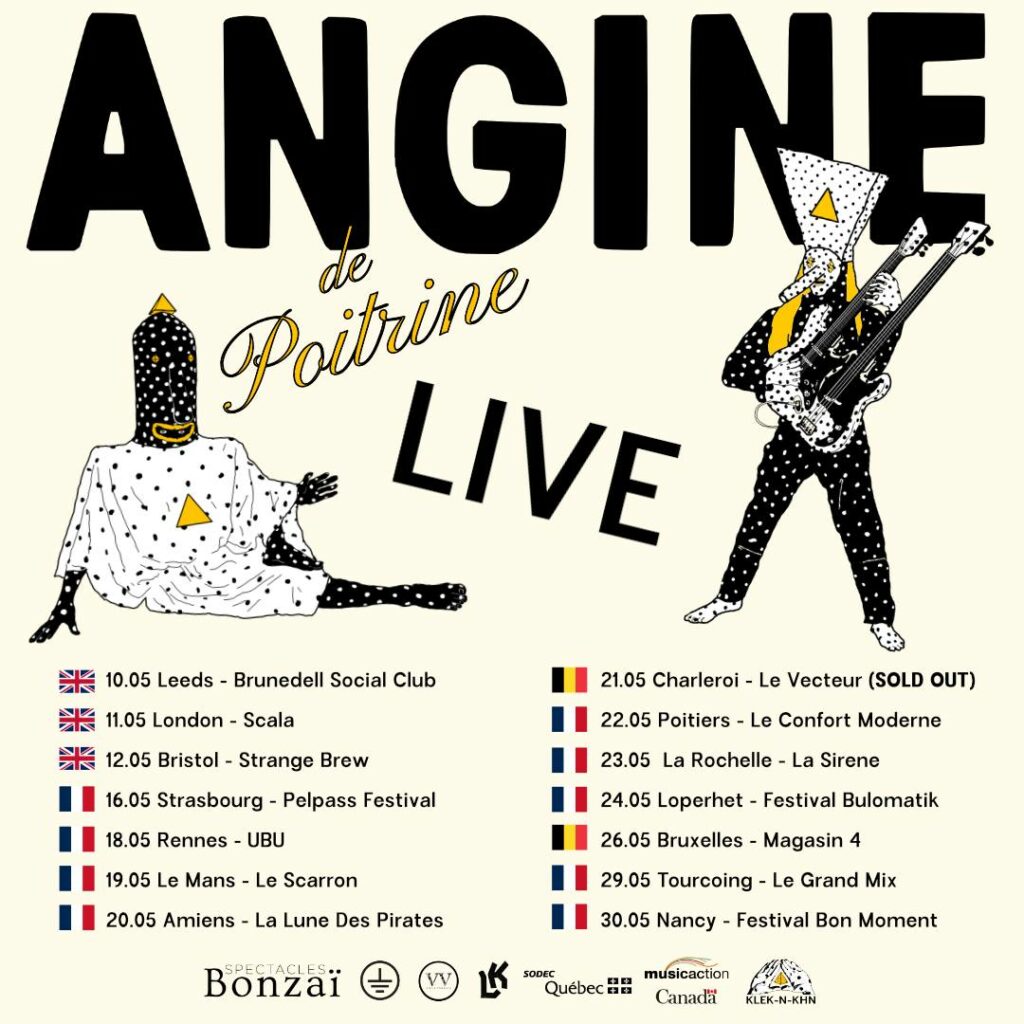 Avec leur Mantra-rock dada-pythago-cubiste, les espiègles frères de Poitrine invitent à s’égarer dans un vortex de motifs sonores et visuels hypnotisants. À priori asymétrique et dissonante, la musique de ces deux êtres aux grandes tronches incite surprenamment à la danse. Une fois assis sur de solides grooves de batterie, les enchevêtrements complexes de guitares microtonales prennent des airs festifs, le tout dans une exubérance typiquement rock’n’roll. Angine de Poitrine est un projet artistique anonyme. Toute information ou spéculation relative à l’identité de ses membres est non confirmée et ne bénéficie d’aucune validation officielle du groupe.