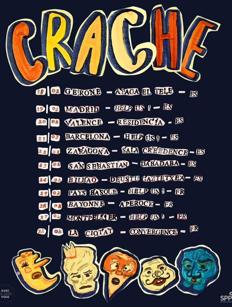 Plein Soleil est le premier album du groupe de synth-punk CRACHE. Formé en 2022 à Marseille, le quatuor n’a cessé de se produire dans les caves de France et de Belgique, poussé par l’énergie punk incandescente de leurs EP : Crache (2023) & Éclaircie Sauvage (2024). Plein Soleil apporte une couleur plus sombre, mélancolique et poétique, sans pour autant bouder les mélodies entêtantes et les cadences infernales qui ont fait l’identité de la formation. Neuf titres composent ce disque enregistré en grande partie live, dans le froid d’une grange des Pays de la Loire au mois de septembre 2025 par Arthur Hecky pour Pollen Session. Ces compositions détonnent par leur chant en français rare pour le style et leurs expérimentations sonores caractérisées par la destruction sonique analogique. Une belle entreprise menée par Rémi Gettliffe du White Bat Recorder au mixage, habitué des sonorités colossales sur bande magnétique. Le 13 mars 2026 sort donc Plein Soleil sur le label hyperactif Howlin’ Banana. Entre tension et éclats sensibles, la mélancolie s’étale au rythme effréné de chansons enivrées et naïves. De la confusion, CRACHE surgit, vital et bruyant.
